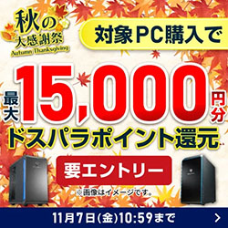 国内で、大手BTOメーカードスパラから購入可能ということで、購入の手間が面倒でないというところは大きいところだと思います。ドスパラなら会員であればポイントもつきますので、更にお得です。