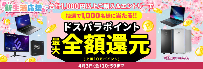 2026年3月現在、ドスパラでは「新生活応援キャンペーン」を実施しています。いつもより明らかにお得なキャンペーンがいくつもあって、BTOパソコンを買うには最適な時期だと実感できます。